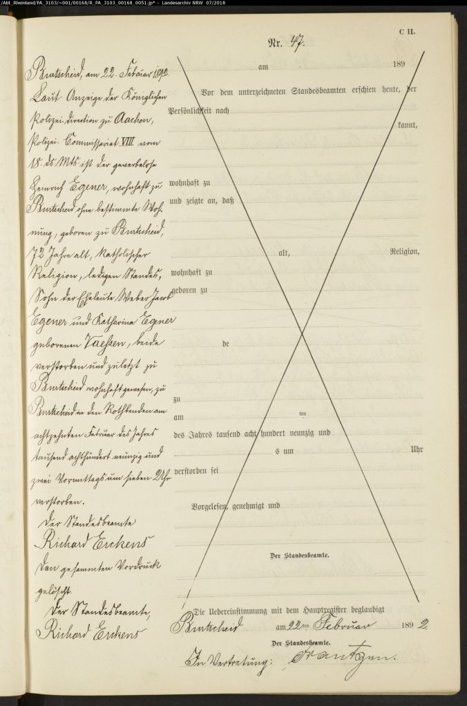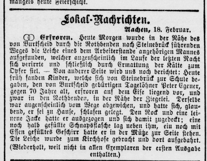 Erfroren. Heute Morgen wurde in der Nähe des von Burtscheid durch die Rothbenden nach Steinebrück führenden Weges die Leiche eines dem Arbeiterstande angehörigen Mannes aufgefunden, welcher augenscheinlich im Laufe der letzten Nacht sich verirrte und schließlich durch Ermattung der Kälte zum Opfer fiel. – Von anderer Seite wird uns noch berichtet: heute früh fanden Kinder, welche sich von Steinebrück zur Schule begaben, den von Burtscheid gebürtigen Tagelöhner Peter Egener, gegen 70 Jahre alt, erfroren auf dem Eise liegend vor, und zwar in den Rothbenden, in der Nähe der Ziegelei. Derselbe war augenscheinlich vom Wege abgewichen, und hatte sich, glaubend, er sei zu Hause, schlafen gelegt. Den Rock und eine leinene Jacke hatte er ausgezogen und sich damit zugedeckt; eine noch halb gefüllte Schnapsflasche lag neben ihm, ein noch mit Essen gefülltes Geschirr hatte er in der Mütze zur Seite stehen. Die Leiche wurde zum Kirchhofe gebracht und dort aufgebahrt. (Wiederholt, weil nicht in allen Exemplaren der ersten Ausgabe enthalten.)