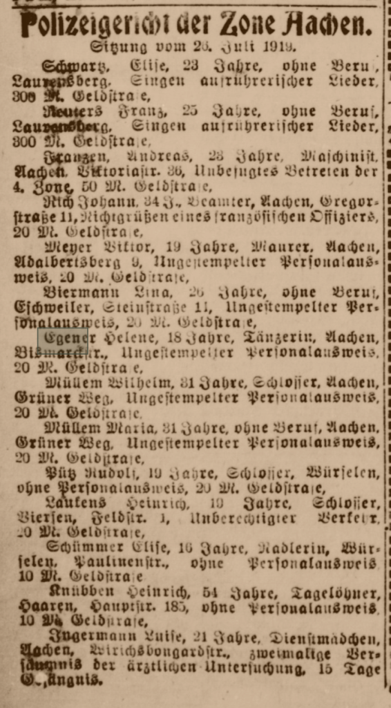 Kurz nach dem Ende des Ersten Weltkriegs stand Aachen unter der strengen Verwaltung der französischen Besatzungsmacht. Das Leben war nicht nur von den Nachwirkungen des Krieges gezeichnet, sondern auch von einem engmaschigen Netz an Verordnungen und Kontrollen, das den Alltag der Bevölkerung bestimmte. Ein kürzlich aufgetauchtes Protokoll des Aachener Polizeigerichts vom Juli 1919 gewährt uns einen faszinierenden und oft schockierenden Einblick in diese Zeit. Es listet nüchtern die Vergehen und Strafen einfacher Bürger auf und zeichnet so ein lebendiges Bild von Unterordnung, Kontrolle und Handlungen, die als Akte passiven Widerstands gewertet werden konnten.